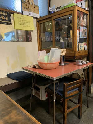 ステキワールドの目印である暖簾が店内にしまわれている状態でした。 そしてテーブルの上には普段置かれているはずのない道具が干してあり、店内にも神直筆の張り紙がありました。